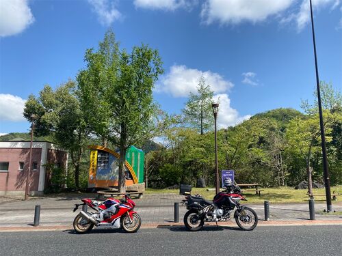 GSとCBR2台で朝からツーリング 舞鶴自動車道のPA もう既に暑い 僕は春秋用のライディングジャケットやったけど、友人が面白い事に朝少し寒かったから冬用のライディングジャケットを着て来たよ かなり暑い中道の駅マキノ追坂峠に初出没‼️ 道の駅のスタンプを…